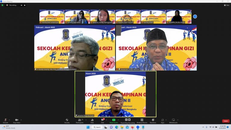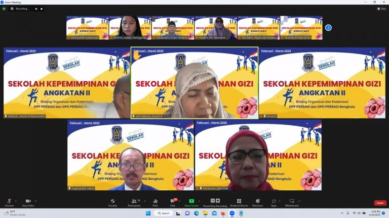 Sekolah Kepemimpinan Gizi yang bekerja sama dengan DPD PERSAGI Bengkulu ini dibuka pada hari ini dengan menyanyikan lagu Indonesia Raya, lagu Mars Gizi, dan Himne PERSAGI, lalu dilanjutkan dengan Laporan Ketua Panitia, Ibu Iswati, SKM, MM, dan dilanjutkan Sambutan serta Keynote Speech oleh Ibu Ketua Umum DPP PERSAGI Rudatin, SSt.MK, SKM, M.Si yang sekaligus menjadi materi pertama bagi para peserta. Sembari mengingat pesan dari Ibu Ketum saat pembekalan kemarin (19/02/2023), peserta diminta memahami dan mendiskusikan topik terkait "Aktualisasi Sekolah Kepemimpinan Gizi oleh Anggota PERSAGI di Berbagai Instansi/Lembaga".