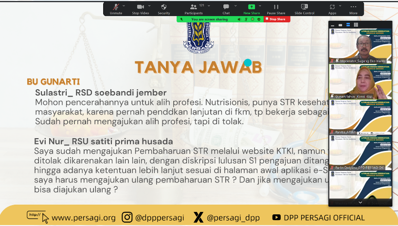 Para panelis memberikan sudut pandang mengenai etika keprofesian dan pentingnya kerja sama interprofesional dalam pelayanan gizi. Sesi tanya jawab didominasi oleh pertanyaan peserta mengenai kebijakan Surat Tanda Registrasi (STR) dan Surat Izin Praktik (SIP) yang diatur dalam UU baru.