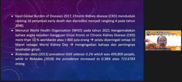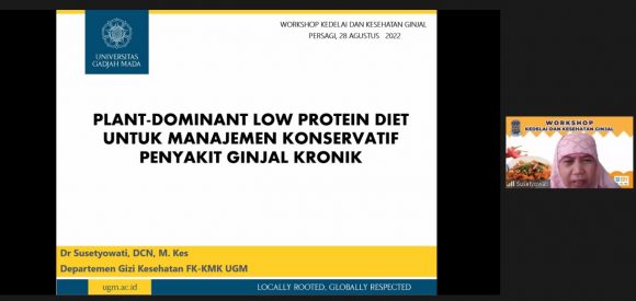 Ibu Dr. Susetyowati, DCN, M.Kes. kemudian melanjutkan penyampaian materi sebagai narasumber kedua dengan topik âPLADO (Plant-Dominant) Diet untuk Manajemen Konservatif Penyakit Ginjal Kronik (PGK)â. Bahasan yang disampaikan mencakup beban Disability-Adjusted Life-Years (DALY) penyakit ginjal kronik secara global dan nasional; efek diet protein tinggi/rendah dominan hewani/nabati terhadap kesehatan ginjal; serta manfaat, keamanan, dan kecukupan dari pola makan PLADO tersebut